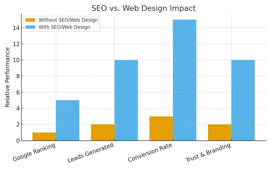 Good design supports SEO with faster load times, mobile responsiveness, and keyword-friendly page structures. Without these, your rankings suffer.